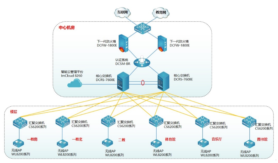 无线整体方案从无线的覆盖、稳定可靠、无线性能及容量、易认证、无缝漫游和易维护的需求出发。无线接入采用先进的802.11ac协议的AP,根据不同的场景,采用不同的覆盖模式,保证学校的无线信号最优,由于教学楼、办公楼、宿舍楼、图书馆等楼宇用途不同,建筑结构相差很大,因此无线的覆盖应该从校园的实际情况出发,采用场景化精细化的无线覆盖,保证无线覆盖最优化,以取得更好的用户体验。在学校人员活动密集的场景,采用高性能WL8200-I3无线AP进行覆盖,内置三个射频,整机支持8条空间流,支持4X4:4 MU-MIMO,最高可给予2900Mbps无线速率;在室内房间多,用户多,布局复杂,墙体分布密集,信号衰减大,需要考虑每个宿舍的无线速率和覆盖,同时需要考虑经济和成本,采用WL8200-WH2墙面AP,直接安装在标准的86面板上,给予1个千兆上联接口,4个千兆下联接口,实现有线无线一体化接入;对办公室办,用户数量偏少等场景,采用WL8200-I2 (R2) AP,整机最大接入速率1317Mbps,满足用户的高速接入,提升性价比;在室外,操场等面积空旷,由于环境复杂,气候恶劣等,安全难度大等特点,采用WL8200-IT3室外AP,使用工业标准元器件,IP68防护等级设计,坚固、防水、防尘,防雷,可应用于恶劣的室外环境,内置定向天线设计,天线增益10dBi,可给予高性能的无线网络覆盖效果。