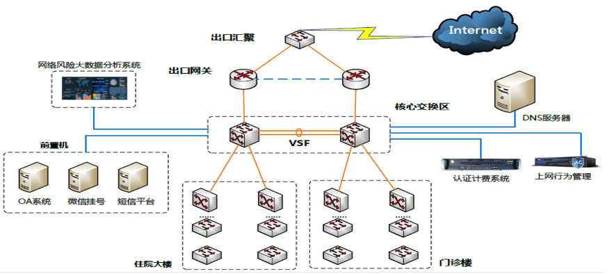 在医院出口边界部署2台负载均衡出口路由采用HA主备模式部署,为外网给予多条出口线路的链路负载均衡功能,包含出口汇聚交换机CS6200-8G24S2Q-EI。为统一管理所有外网网络设备,新增上网行为审计系统DCBC-3000、外网管理平台DCLM-ITMS,顺利获得统一网络设备运维管理系统,实现IT网络资源的全方位监控管理,方便网络管理人员对分散的无线和有线局域网设备进行统一管理,及时发现网络故障,保证网络有序稳定运行,显著地降低了网络运营成本。另外,为用户进入医院外网以及访问互联网的安全门户规划部署网络风险大数据分析系统DCBC-MS,部署一套认证计费系统DCSM-BR以给予集中的宽带网络用户认证,授权和计费,及接入策略管理,使管理账户时能够方便的对网络用户的宽带服务统一管理。